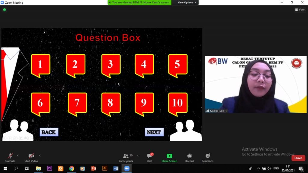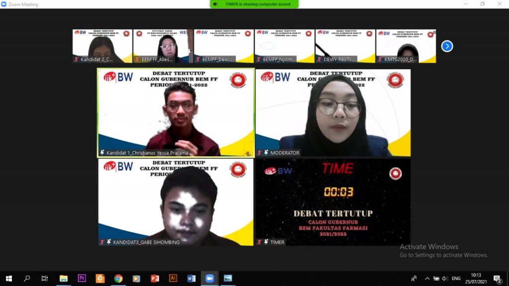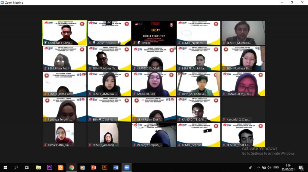 Acara Debat Tertutup Calon Gubernur Badan Eksekutif Mahasiswa Fakultas Farmasi 2021/2022 Institut Ilmu Kesehatan Bhakti Wiyata Kediri yang dilaksanakan pada tanggal 25 Juli 2021 melalui media Zoom Meeting.