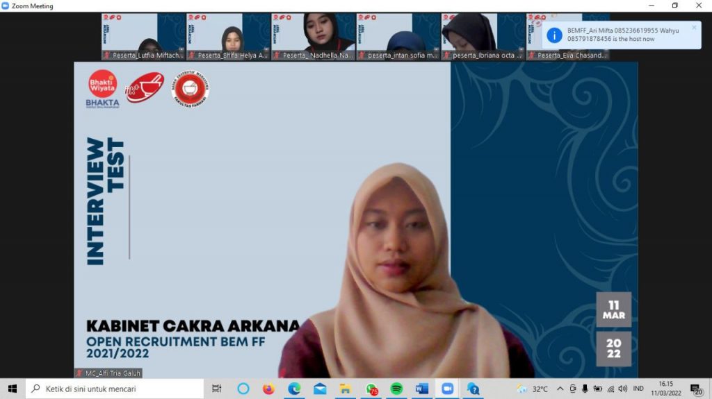 Tes wawancara dilakukan pada Jum’at, 11 Maret 2022 secara bergantian menggunakan Zoom, menggunakan system Break Zoom. Pengumuman oprec dilakukan pada tanggal 16 Maret 2022. Pengumuman tersebut diumumkan melalui email dari masing-masing peserta.