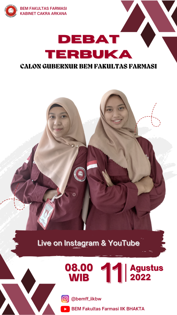 Untuk meneruskan kegiatan-kegiatan positif diatas, maka BEM Fakultas Farmasi Institut Ilmu Kesehatan Bhakti Wiyata ingin mengadakan Debat Terbuka Calon Gubernur BEM FF untuk Periode 2022/2023.