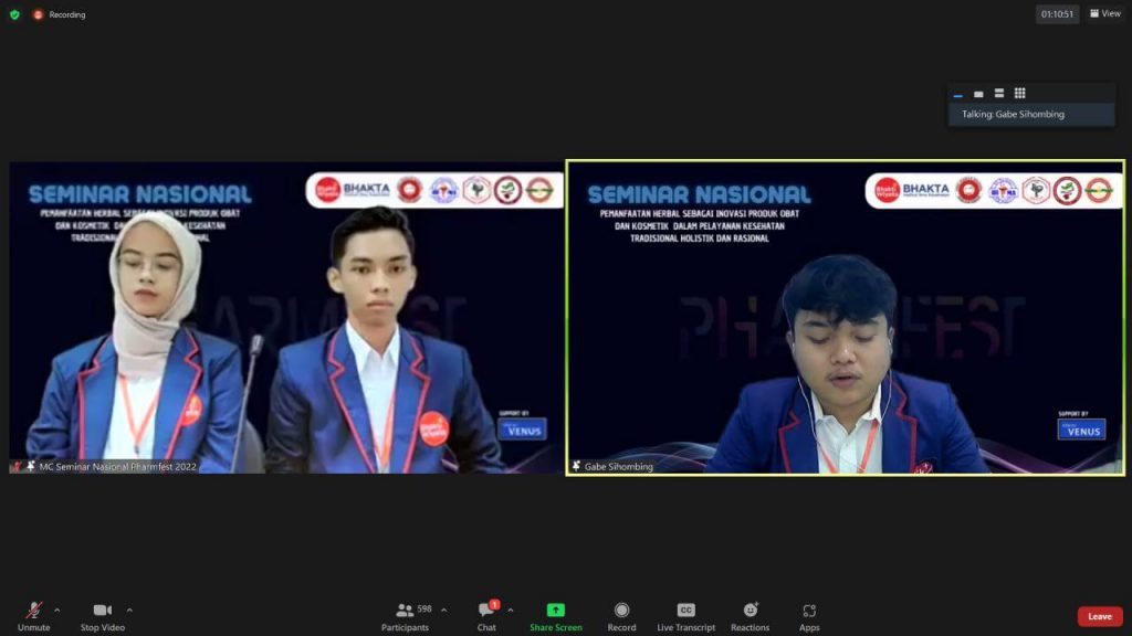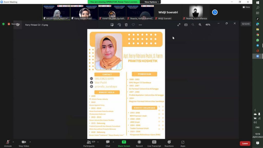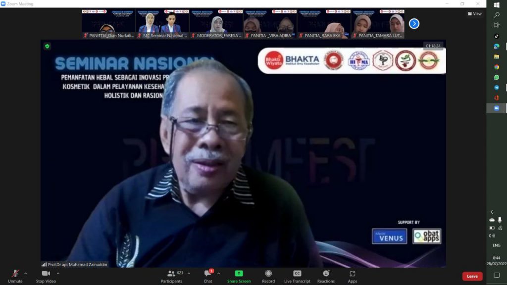 Acara dimulai pada hari Kamis, 28 Juli 2022 dengan menggunakan media zoom meeting. Seminar Kefarmasiaan ini mengusung tema “Pemanfaatan Herbal Sebagai Inovasi Produk Obat dan Kosmetik Dalam Pelayanan Kesehatan Tradisional Holistik dan Rasional”. Acara dimulai pukul 07.00 – 11.35 WIB. Pada acara seminar ini mendatangkan 2 narasumber yaitu Prof. Dr. Apt Widji Soeratri, DEA sebagai Akademika Universitas Airlangga Surabaya dan Apt. Ferry Fitriani Putri, S.Farm sebagai Konsultan Klinik Kecantikan Pronafa Owner Tsuraya Beauty Care. Kegiatan ini disponsori oleh KFTD Malang.
