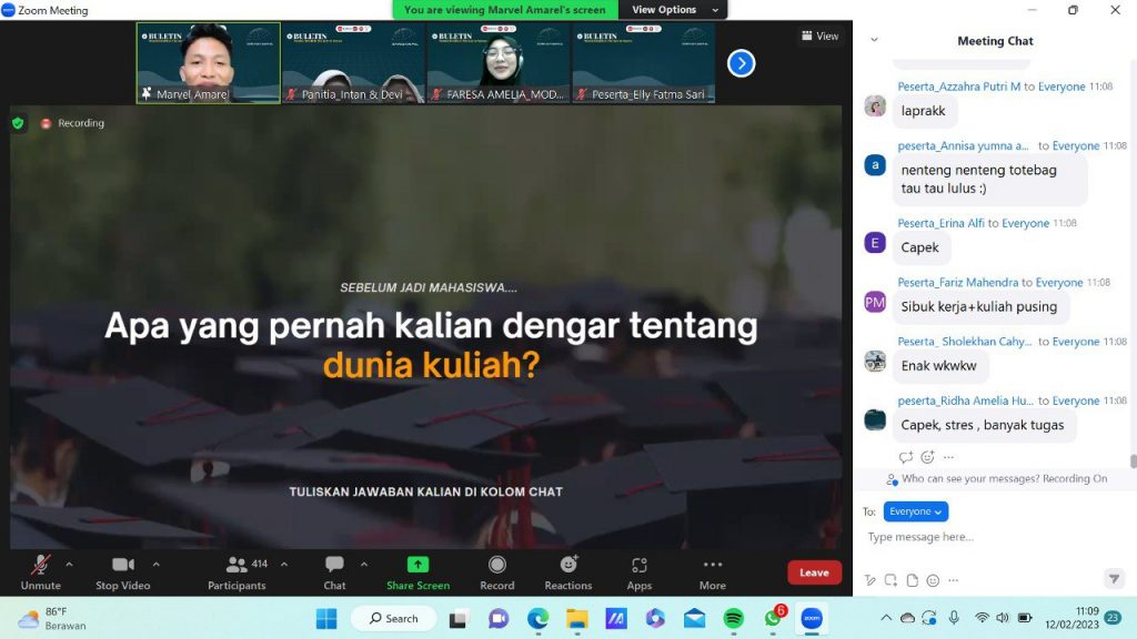Acara dimulai pada hari Minggu, 12 Februari 2023 pukul 07.00 – 08.00 dengan dilakukan regristasi peserta Seminar Buletin dengan menggunakan media google form dilanjutkan penayangan teaser.