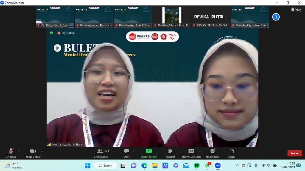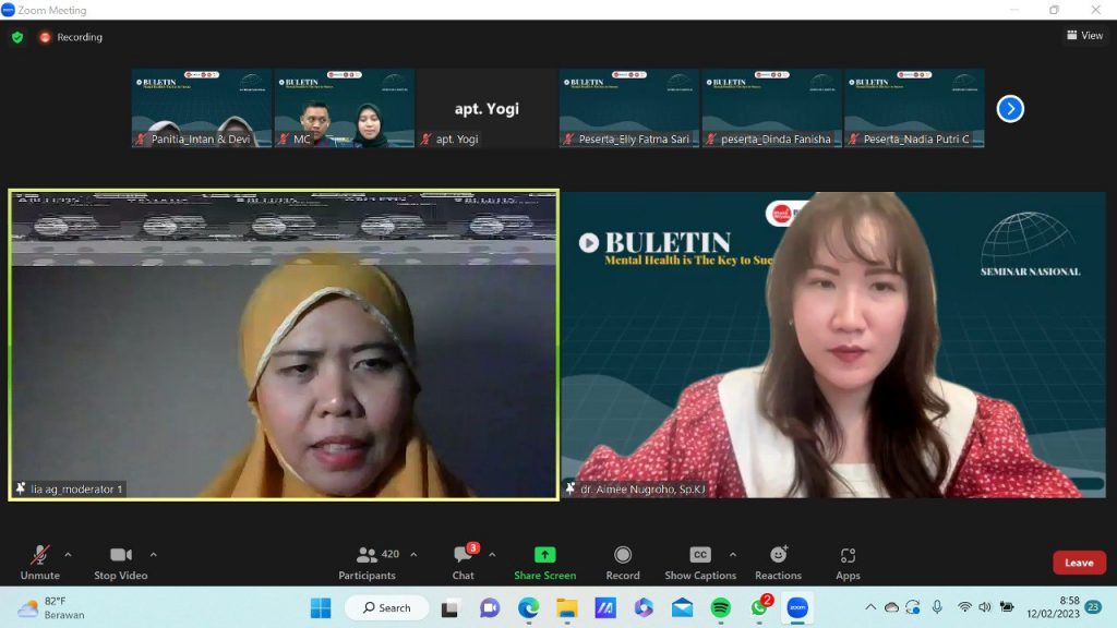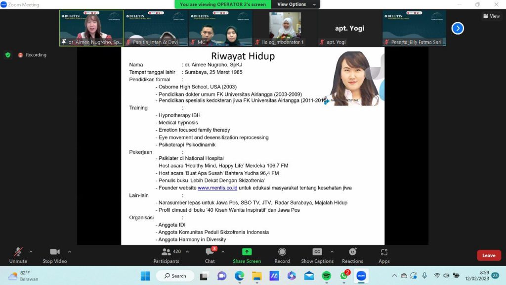 Pada pukul 09.00 dilakukan pembacaan CV Ibu apt. Lia Agustina, S.Si., M.S selaku moderator pertama oleh MC, dilanjutkan dengan perkenalan Ibu apt. Lia Agustina, S.Si., M.S. Pada pukul 09.05 pembacaan CV dr. Aimee Nugroho., SpKJ oleh Ibu apt. Lia Agustina, S.Si., M.S.