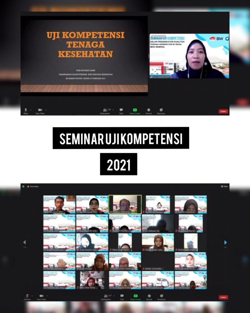 Dalam menjalankan amanah pada pasal 21 undang-undang Nomor 36 Tahun 2014 Tentang Kesehatan, mahasiswa bidang kesehatan pada akhir pendidikan vokasi dan profesi harus mengikuti uji kompetensi secara nasional. Selain itu, uji kompetensi secara nasional diperlukan dalam upaya standarisasi dan menjamin mutu lulusan pendidikan tinggi dibidang kesehatan. Maka dari itu BEM FKES Institut Ilmu Kesehatan Bhakti Wiyata Kediri mengadakan kegiatan “Seminar Uji Kompetensi dalam peningkatan kualitas tenaga kesehatan dimasa new normal“. Pemateri pertama Dr. Yuni Suryanti Arief, S. Kp., M.Kes dengan materi uji kompetensi untuk tenaga kesehatan dan pemateri ke-dua oleh Ibu Yefi Purwasih, SST., M. Kes dengan materi Trik – trik untuk menghadapi ujian kompetensi dengan hasil maksimal (lulus).