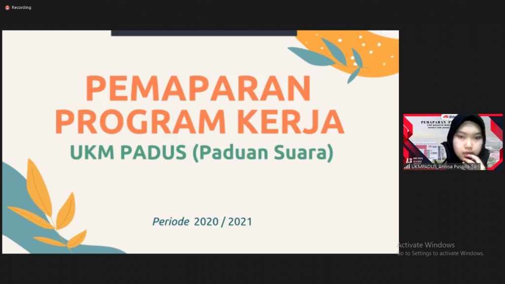 Ketua Pelaksana Dhiva Salsabia menyampaikan “ Terima Kasih banyak saya ucapkan kepada Deputi Penjaringan Kemahasiswaan dan Alumni dan jajarannya karena telah hadir dalam acara pemaparan program kerja Unit Kegiatan Mahasiswa. Walaupun sekarang kita berada dalam situasi dan kondisi yang kurang baik, dimana semua kegiatan dilaksana kan secara daring semoga saja tidak menjadi penghalang dan mengurangi semangat kita dalam mensukseskan program kerja kita kedepanya. Harapan saya semoga program kerja yang telah disusun, dapat terlaksana dengan baik selama 1 periode kedepan demi kemajuan organisasi dan kampus kita tercinta. Tetap semangat teman-teman semuanya dan semoga pandemi ini segera berakhir supaya kita dapat melaksanakan setiap program kerja seperti sedia kala.”
