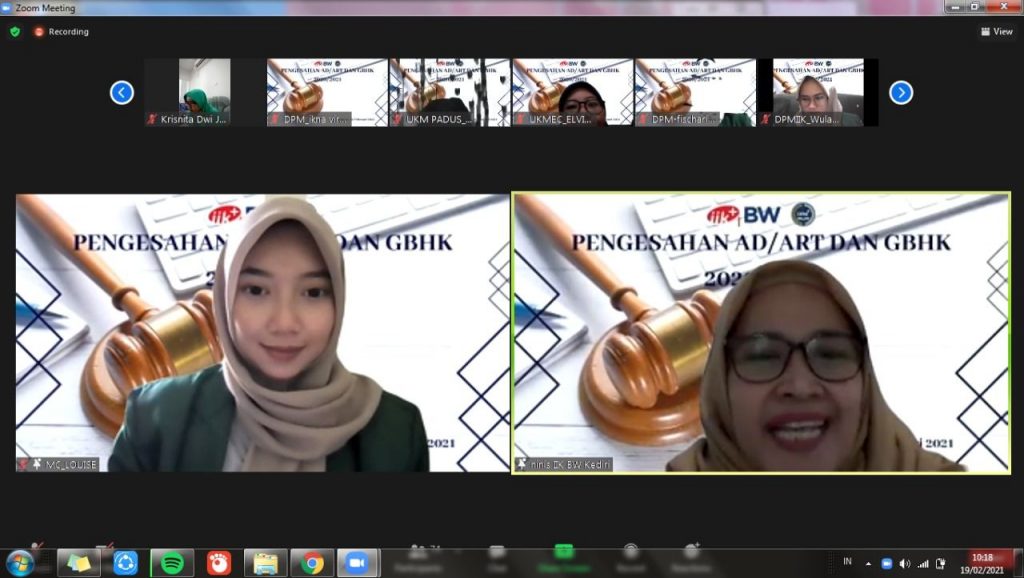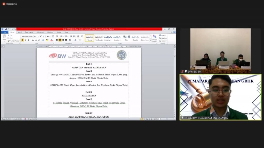 Pengesahan AD/ART, GBHK dan SBK diselenggarakan pada tanggal 19 Februari 2021. Turut hadir Deputi Penjaringan Kemahasiswaan dan Alumni, Dekan Fakultas IIK Bhakti Wiyata, Kepala Program Studi IIK Bhakti Wiyata, Dosen Pembimbing UKM dan Perwakilan anggota dari Organisasi Mahasiswa dan UKM. Acara dibuka oleh Direktur Akadmik IIK Bhakti Wiyata Ibu apt. Ninis Yuliati, S.Si, M.Kes. Dalam sambutannya beliau berpesan bahwa ada lima sifat utama yang harus dimiliki saat berorganisasi yaitu, religius, nasionalisme, kemandirian, gotong-royong dan integritas.
