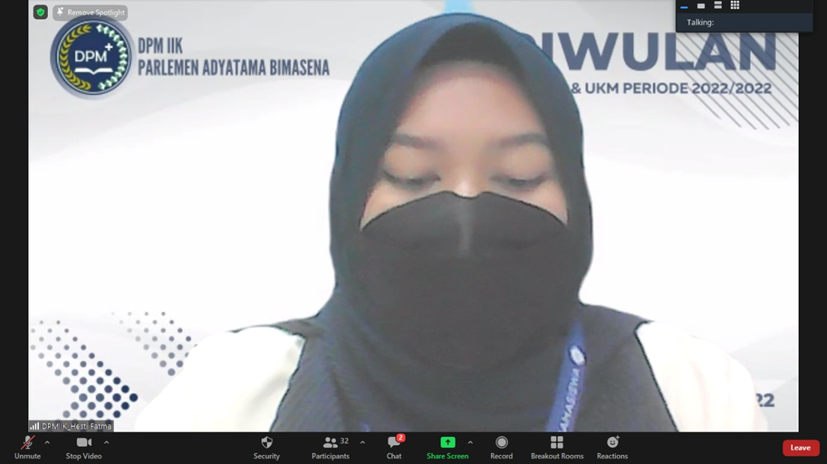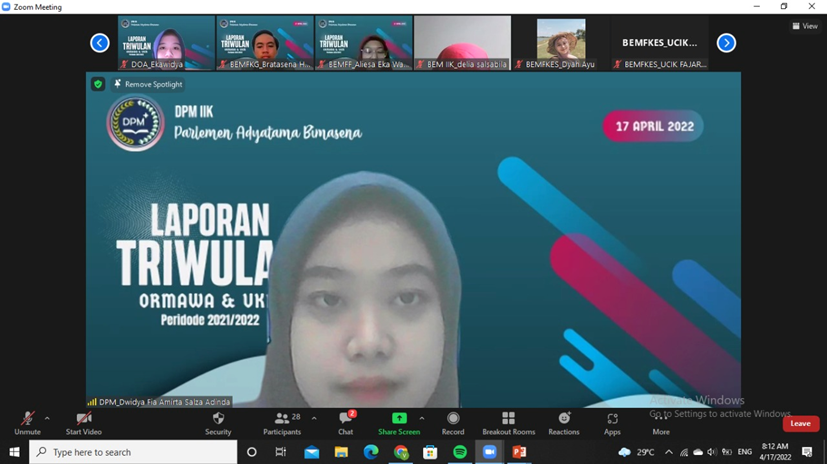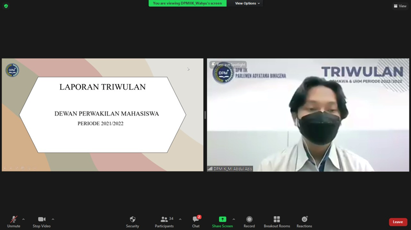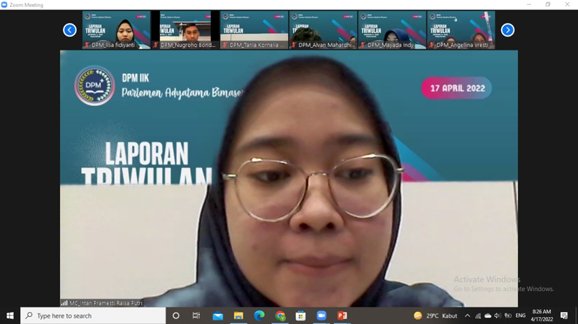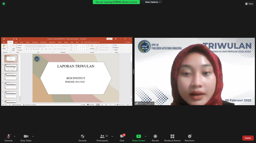 Kegiatan Laporan Triwulan sendiri adalah Suatu Program Kerja seperti LPJ Tahunan tetapi untuk laporan Triwulan ini hanya dipaparkan setiap 3 bulan sekali, kegiatan ini memang program kerja baru yang ada di DPM dan baru dilaksanakan pada periode ini. Selanjutnya, untuk mekanisme kegiatannya sendiri dimulai dengam pemaparan sesi 1 dari ormawa IIK Bhakti Wiyata diantaranya BEM Institut, BEM Fakultas Kedokteran Gigi, BEM Fakultas Farmasi, BEM Fakultas Teknologi Manajemen Kesehatan dan BEM Fakultas Kesehatan memasuki room zoom karena pukul 08.00 WIB acara segera dimulai, sebelum memasuki ke inti acara dibuka oleh MC lalu dilanjutkan dengan menyanyikan lagu Indonesia Raya dan Doa.
