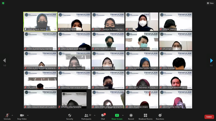 Setelah itu, dilanjutkan dengan sambutan dari Dwidya Fia Amirta Salza Adinda sebagai Ketua Pelaksana lalu pemaparan laporan triwulan pertama dari masing – masing BEM Institut dan BEM Fakultas yang dilakukan di main room zoom disertai dengan evaluasi dari Komisi 2 Kepengawasan atas program kerja yang sudah mereka jalani selama triwulan pertama.