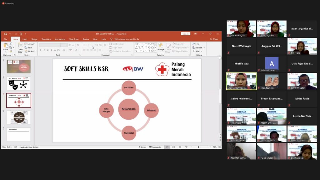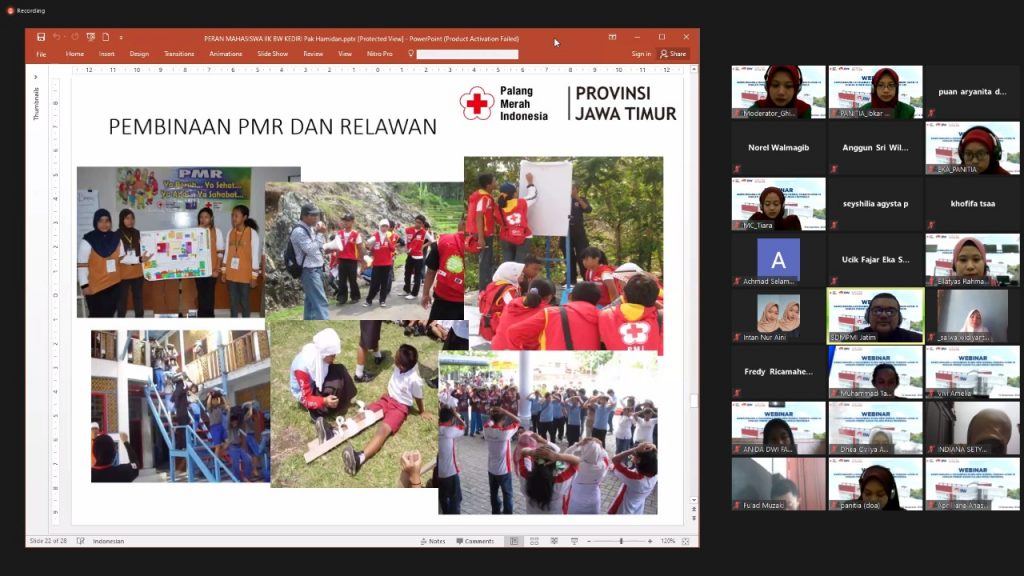 Acara webinar yang diselenggarakan oleh UKM KSR PMI IIK Bhakti Wiyata Kediridimulaipukul 06.00 WIB yang diawali dengan breafing dan persiapan panitia. Setelah itu dilanjutkan dengan Registrasi peserta serta pemutaran video ukm ksr. Kemudian pukul 08.00 WIB pembukaan dan menyanyikan lagu indonesia raya serta mars PMI. Selanjutnya pukul 08.25 sambutan dari Bapak Indra Cahyadinata, SST. FT., M.Kes selaku Debuti Kemahasiswaan IIK Bhakti Wiyata Kediri dan Komandan KSR Eka Alifatul Qodariyah. Selanjutnya pukul 08.50 Do’a dan sesi foto bersama.