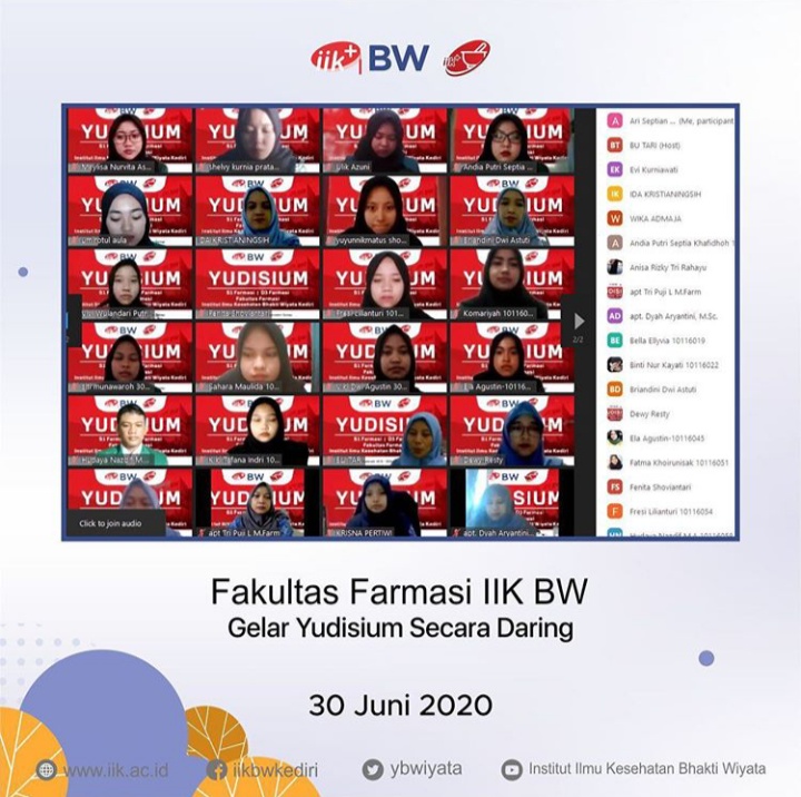 Fakultas Farmasi IIK BW menggelar yudisium daring pada 30 Juni 2020 melalui aplikasi Zoom. Dalam Yudisium daringn tersebut, mahasiswa S1 Farmasi dan D3 Farmasi IIK BW resmi mendapatkan gelar sarjana dan diploma mereka dan mengucap janji lulusan.