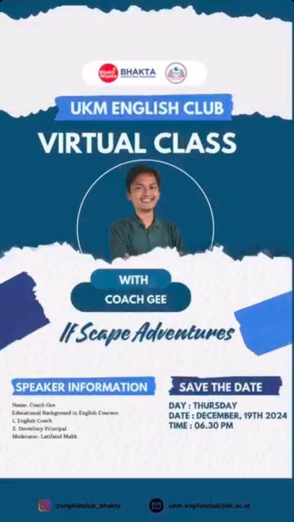Pada hari Kamis, 19 Desember 2024, UKM English Club menggelar pertemuan rutin dengan konsep yang seru dan berbeda dari biasanya. Tema yang disampaikan yakni “If-Scape Adventure”. Kegiatan ini menggabungkan unsur permainan petualangan dan imajinasi dengan sentuhan bahasa Inggris dalam suasana yang ringan dan menyenangkan. Tujuan dari kegiatan ini ialah menumbuhkan keberanian untuk berbicara spontan dalam bahasa Inggris, melatih kerja sama tim dalam suasana santai dan membangun kedekatan antaranggota melalui aktivitas non-formal yang menyenangkan. Kegiatan penuh tawa, kreativitas, dan kehebohan ini diabadikan dalam bentuk foto dan video.