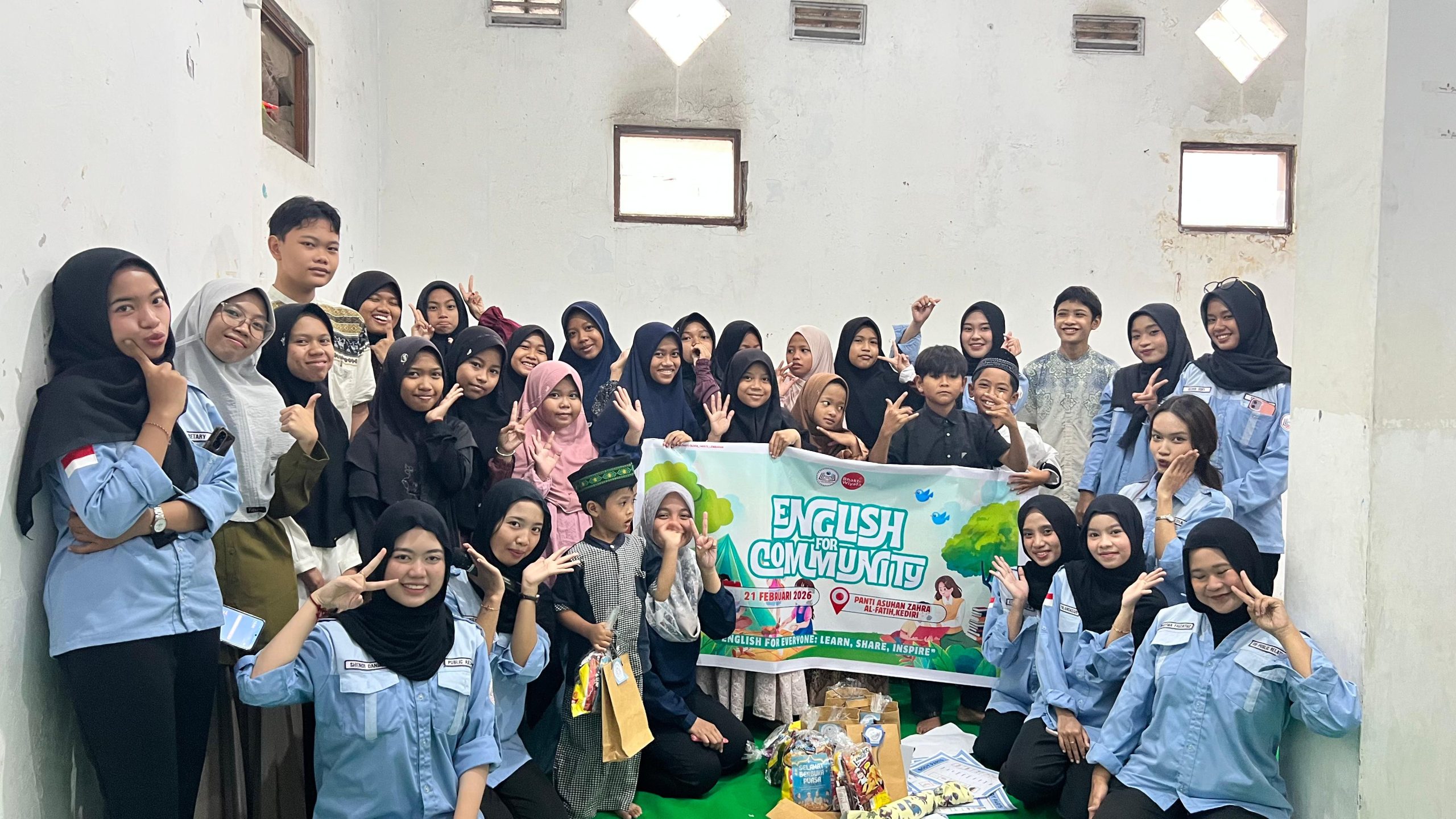Kegiatan English for Community will be held on 21 February 2026, at a panti asuhan Zahra Al-Fatih Kediri, with the main agenda focusing on fun learning and social sharing activities.