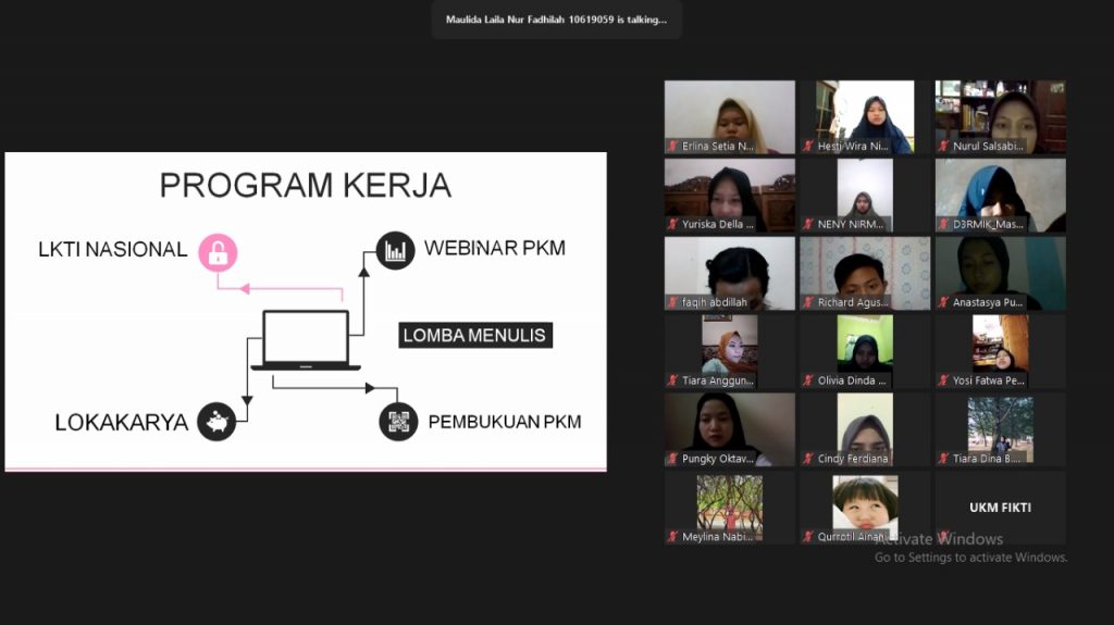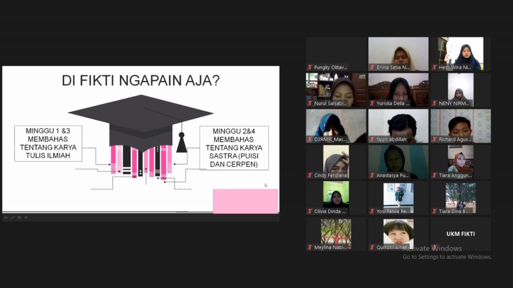 Pada pertemuan pertama UKM FIKTI di tahun ajaran 2020/2021, kami mengenalkan apa saja kegiatan yang akan kami lakukan selama 1 tahun ke depan. Diantaranya adalah, pertemuan rutin setiap 1 minggu sekali, yaitu pada Hari Selasa sesuai dengan kesepakatan bersama. Dimana pada minggu ke-1 dan ke-3 kita membahas tentang karya tulis ilmiah, esai, dan juga makalah, sedangkan pada minggu ke-2 dan ke-4 kita akan membahas tentang karya sastra berupa puisi/cerpen.