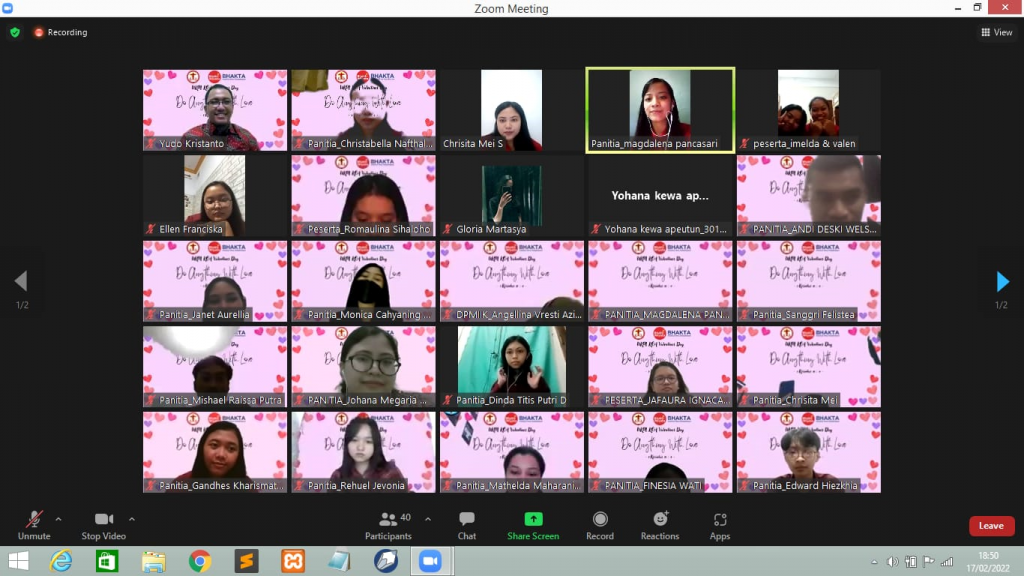 Pada hari Kamis, 17 Februari 2022 UKM Kristen Oikumene Antiokhia menyelenggarakan kegiatan Valentine Day. Acara dilaksanakan secara online melalui Zoom dan dipandu oleh Magdalena Pancasari dari program studi D3 Farmasi 2021. Valentine Day dimulai pukul 17.00 WIB dengan mengambil tema “Do Anything With Love” terambil dari 1 Korintus 16:14.