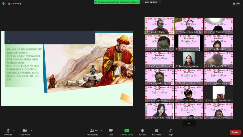 Kemudian memasuki penyampaian materi yang disampaikan oleh Yudo Kristanto, S.Kom . Dalam materi webinar yang disampaikan bahwa kasih bisa kita mulai dari hal yang kecil. Karena kasih bukan hanya sekedar kata-kata, namun kasih adalah tindakan. Rasa belas kasihan yang ada pada kita akan mendorong kita untuk melakukan sesuatu. Kasih adalah sebuah pengorbanan yang menuntut harga. Hendaklah kasih diawali dengan pengenalan yang benar akan Kristus, sehingga kita mampu melakukan segala sesuatunya dengan Kasih.