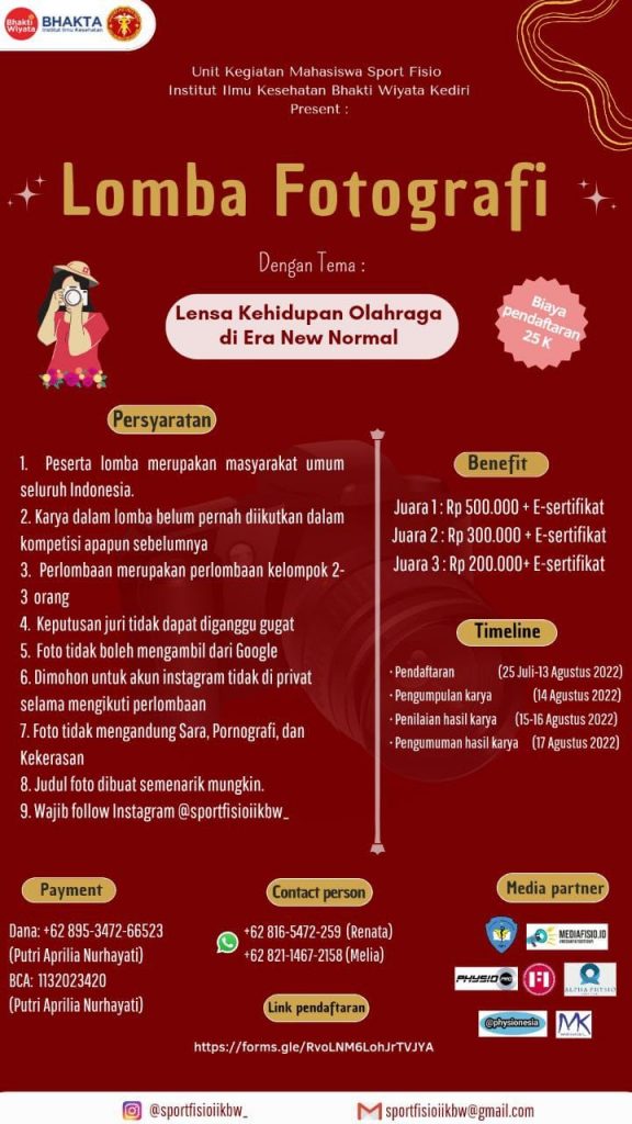 Pada kesempatan kali ini, untuk memperingati hari kemerdekaan dan menjalankan proker UKM Sportfisio INSTITUT ILMU KESEHATAN BHAKTI WIYATA KEDIRI, kita telah mengadakan Lomba fotografi yang dilaksanakan melalui online dengan menggunakan media Google Form dan sosial media Instagram dengan tema “Lensa Kehidupan Olahraga di Era New Normal” dan dapat diikuti oleh seluruh masyarakat. Seperti yang kita ketahui, pada saat ini kita mulai terbebas dari wabah covid-19. Kegiatan yang terbatas membuat terhambatnya berbagai macam aktivitas dan produktivitas. Sosial media adalah salah satu solusi untuk kita mulai kembali mengajak masyarakat untuk mulai beraktivitas olahraga di era kehidupan new normal.